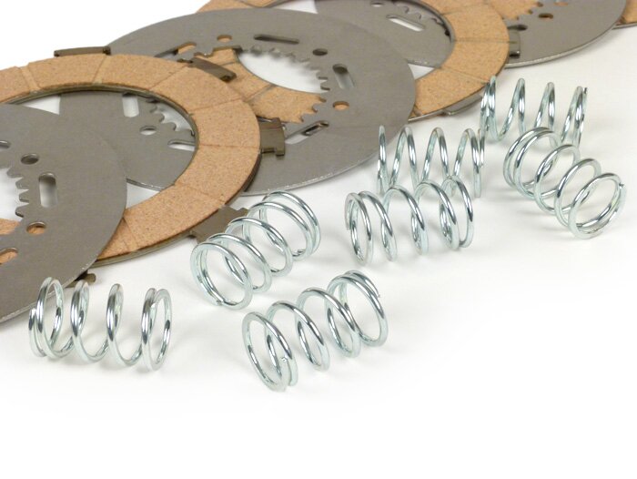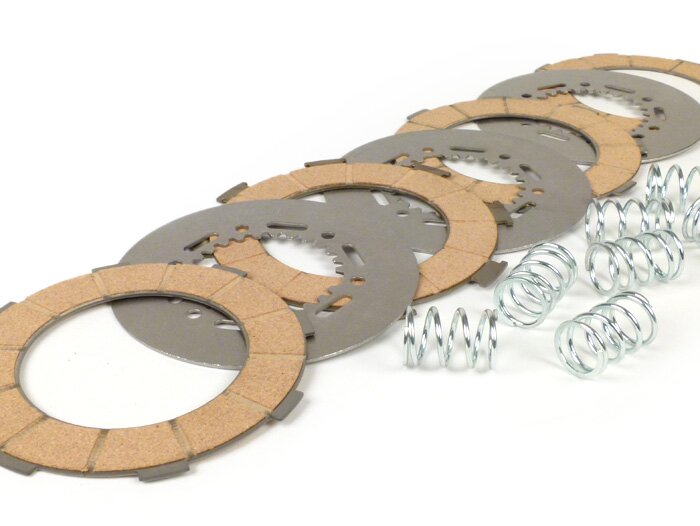 Kit de 4 discos, 3 separadores y 7 muelles reforzados de la marca MALOSSI MHR para embrague de Vespa 200.